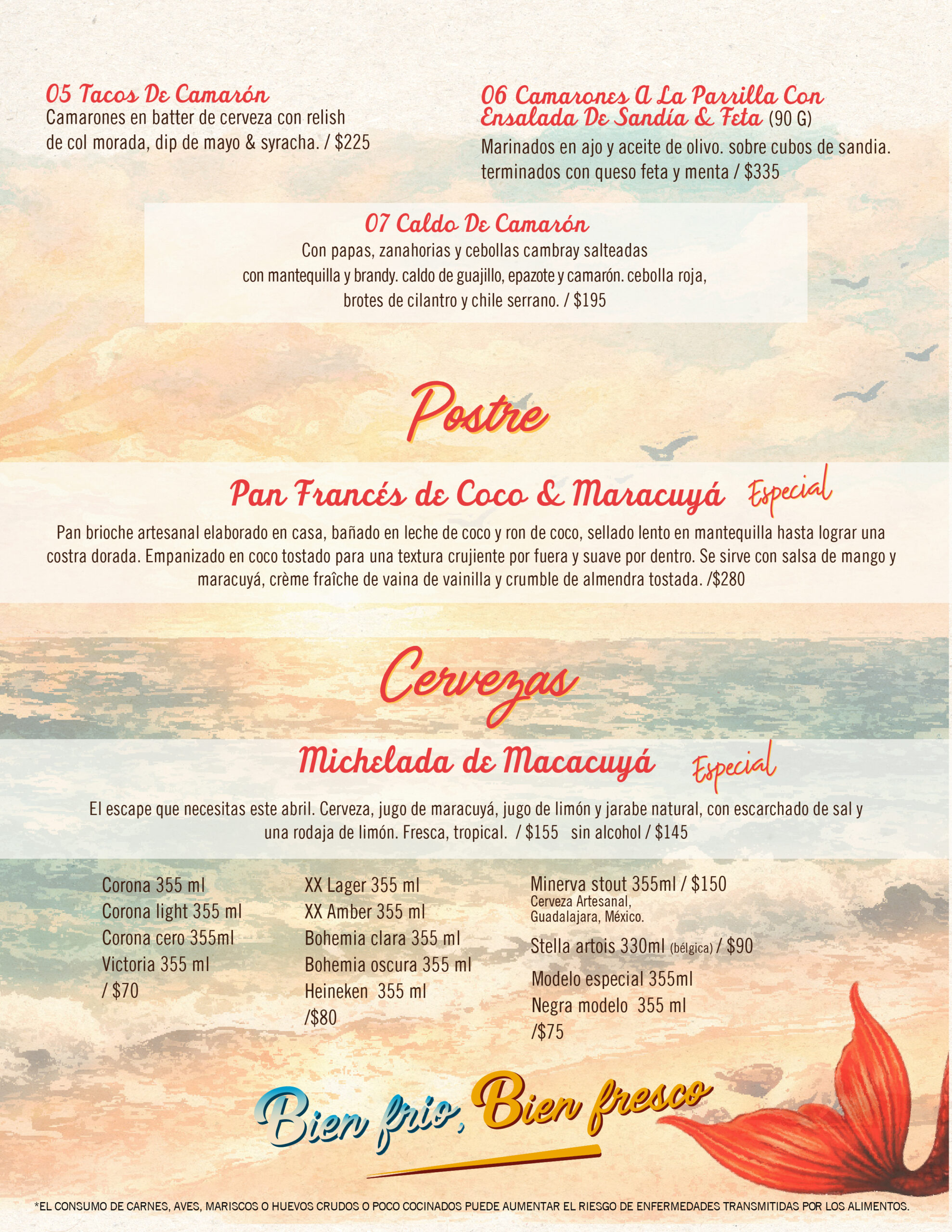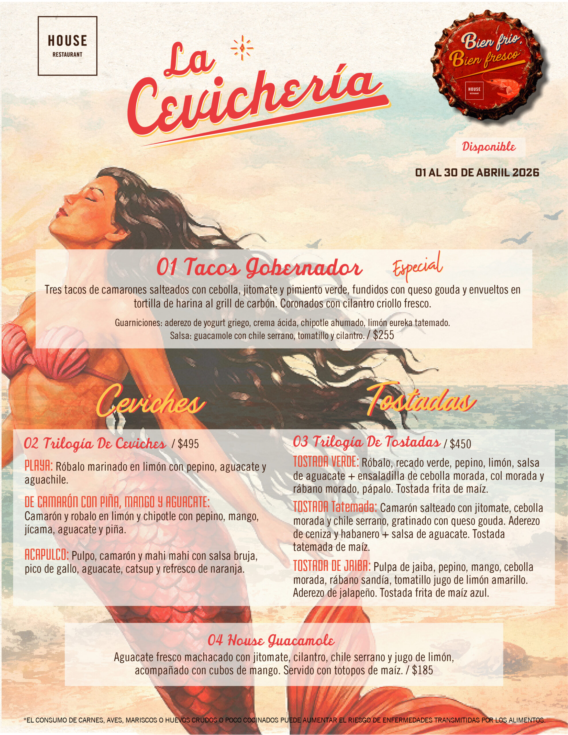 El menú incluye tostadas de camarón, ceviches de robalo y cangrejo, Tacos Gobernador con camarón salteado y queso fundido, y sabores que saben a vacaciones junto al mar. Para acompañar: Michelada de Maracuyá, margaritas de temporada y cocteles frescos de nuestra barra. ¡Esto sí es ceviche! Se antoja.